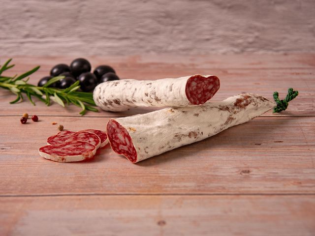 De fuet met zwarte olijven is een gedroogde worst uit Spanje met een zachte, licht kruimelige textuur. De milde, hartige smaak van het vlees wordt aangevuld door de zoute, aromatische tonen van zwarte olijven, wat zorgt voor een mediterrane twist. Ideaal als tapas, op een borrelplank of natuurlijk op de pizza!